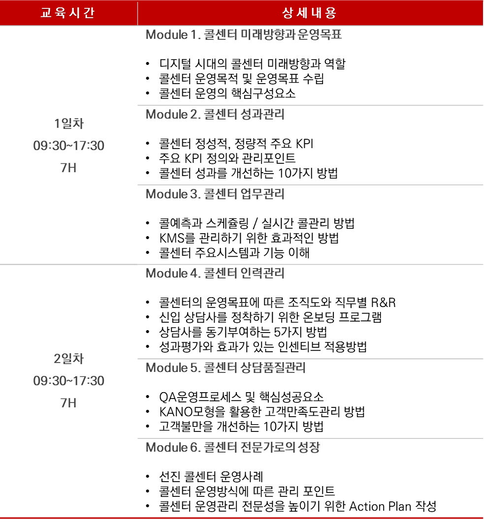 현장 중심의 이론과 실습을 통해 콜센터 전반에 대한 관리 방법을 학습하시기 바랍니다.