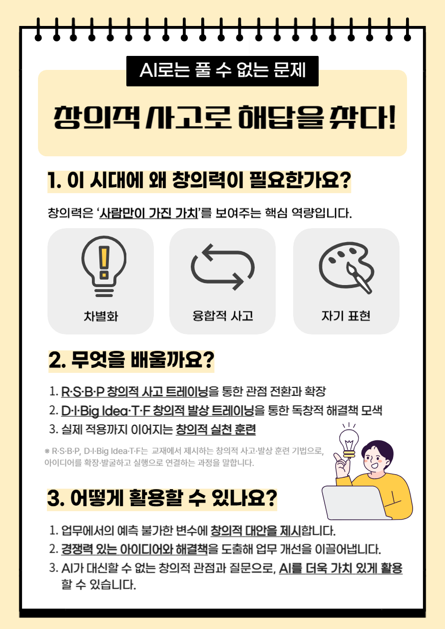 AI가 할 수 없는 창의적 문제 해결 능력을 배양하기 위해, 다양한 사고 훈련법을 익히고, 창의적 사고를 통해 인사이트를 얻는 프로세스를 체계화하여, 실무에서 활용할 수 있도록 실질적 가이드를 제공해드립니다.