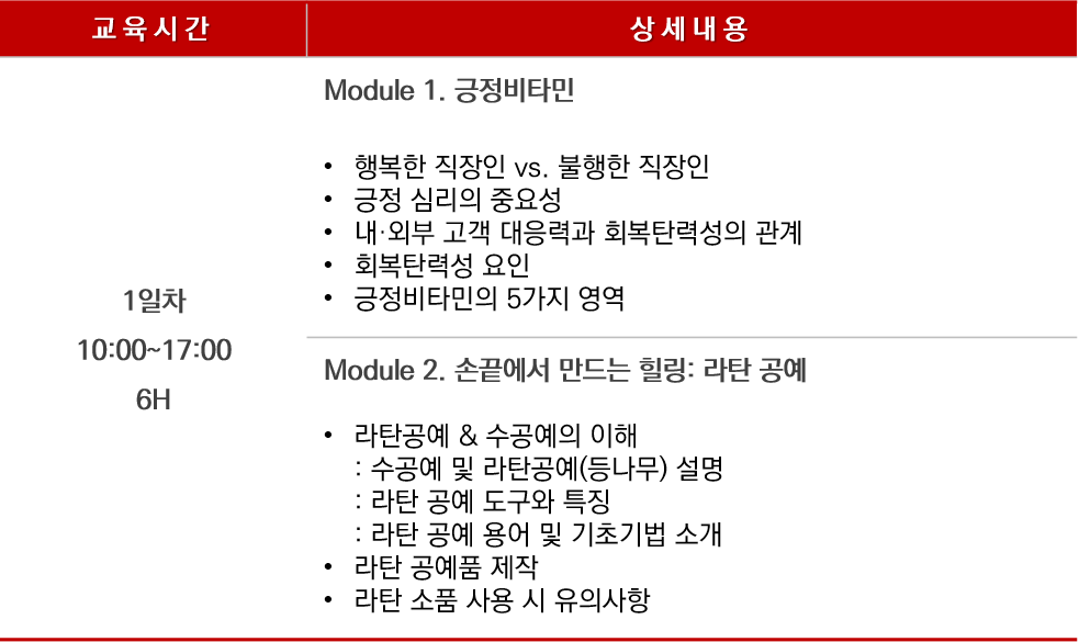 본 과정은 긍정비타민 요소, 라탄 공예를 통해 일상에 지친 비즈니스인의 치유를 돕습니다.