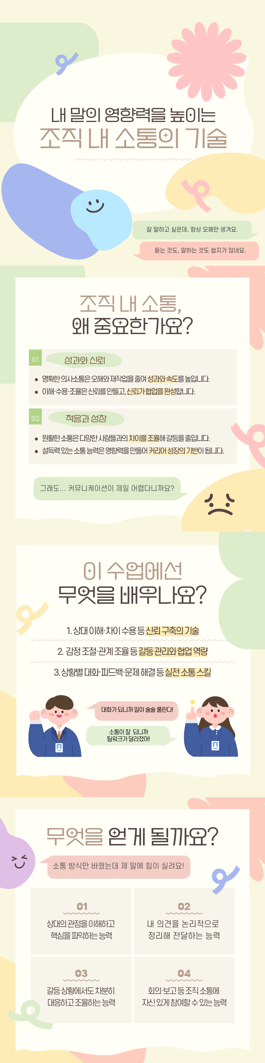 l 조직 내 소통을 원활하게 만드는 기술을 익힐 수 있습니다.