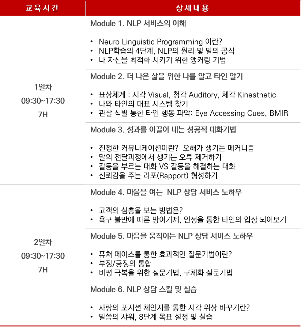 NLP (Neuro Linguistic Programming : 신경언어프로그래밍)기법은 누구나 사용해 자신이 원하는 결과(목표)를 낼 수있는 커뮤니케이션 테크닉, 방법론 입니다. 무의식(잠재의식)을 활용해 고객과의 커뮤니케이션 능력을 비약적으로 향상 시킬 수 있습니다.