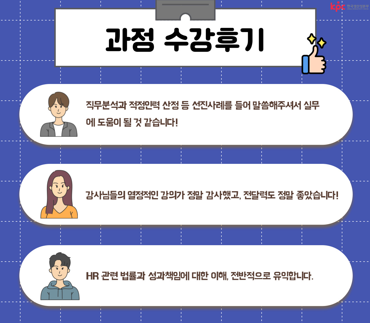 전문 인사담당이 아니여서 인사의 기본적인 흐름이 궁금했는데 많은 도움이 되었습니다. 다음에 기회가 되면 또다른 교육에 참여하 보고싶을 정도로 만족합니다