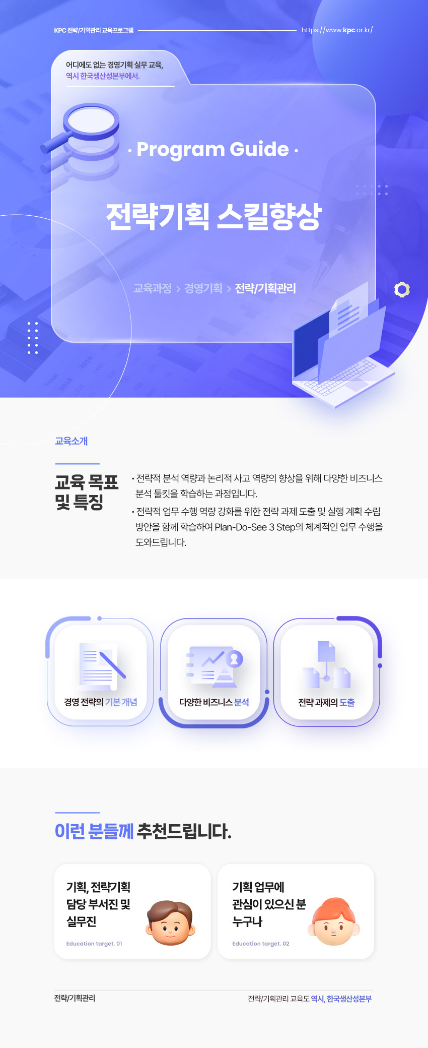 - 전략적 업무 수행 역량 강화를 위한 전략 과제 도출 및 실행 계획 수립 방안을 함께 학습하여 Plan-Do-See 3 Step의 체계적인 업무 수행을 도와드립니다.