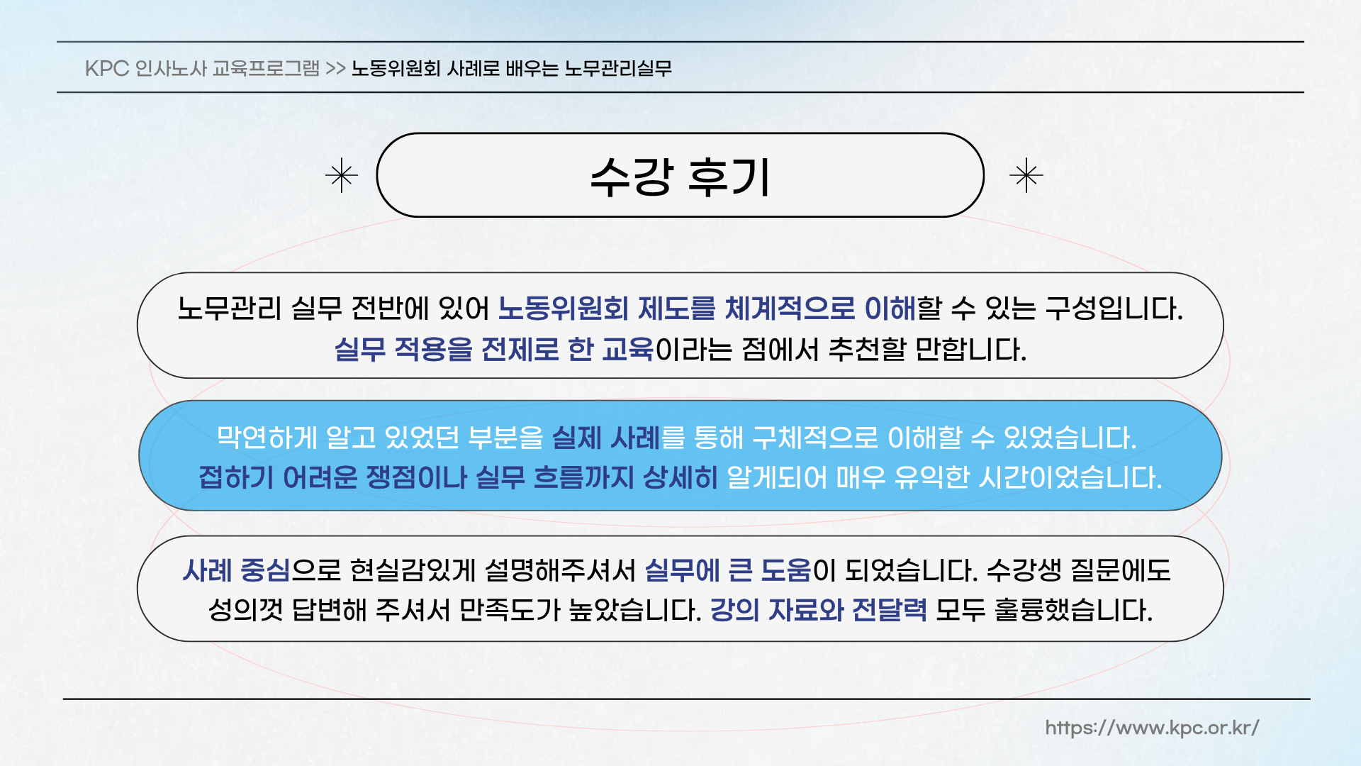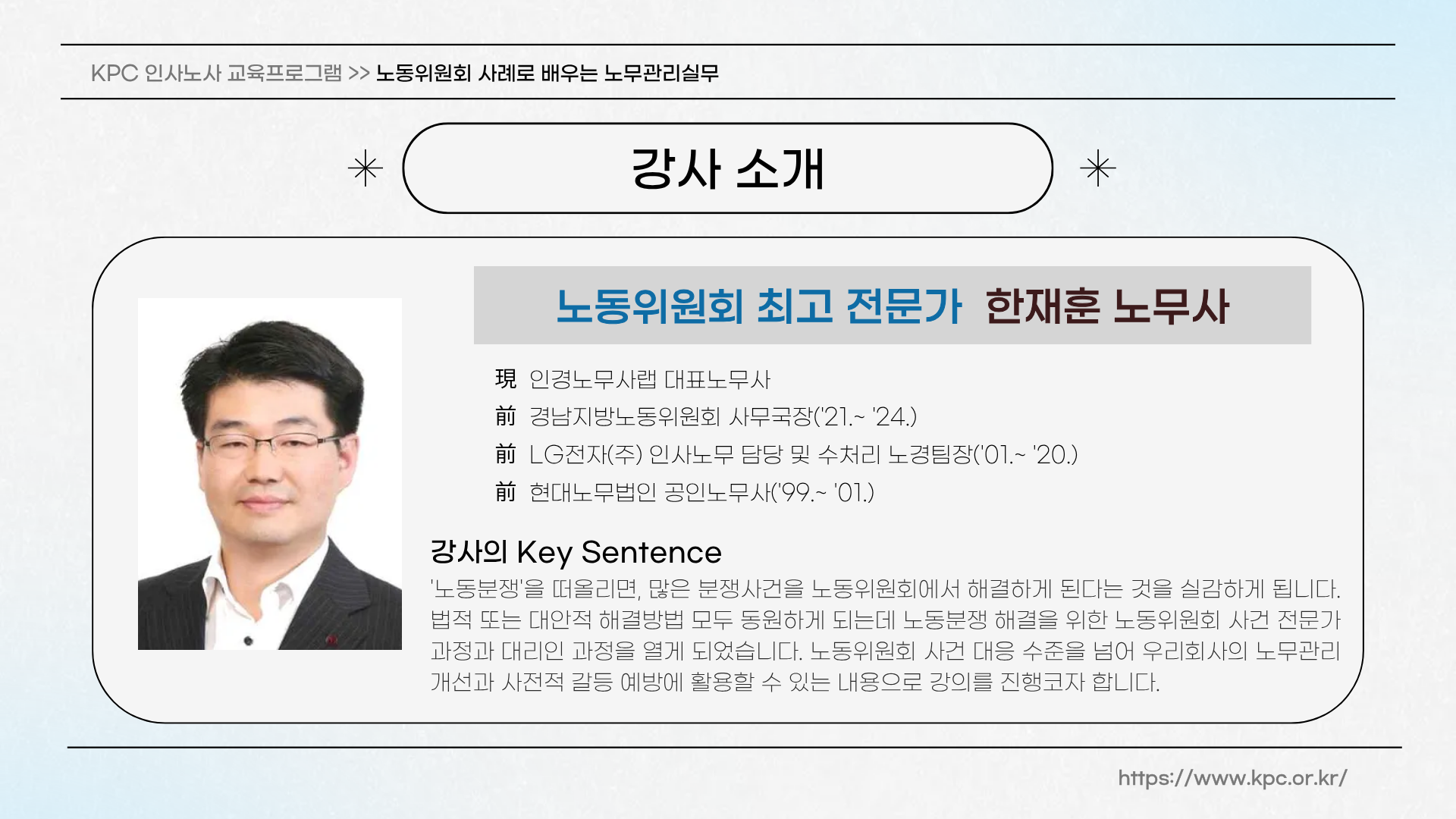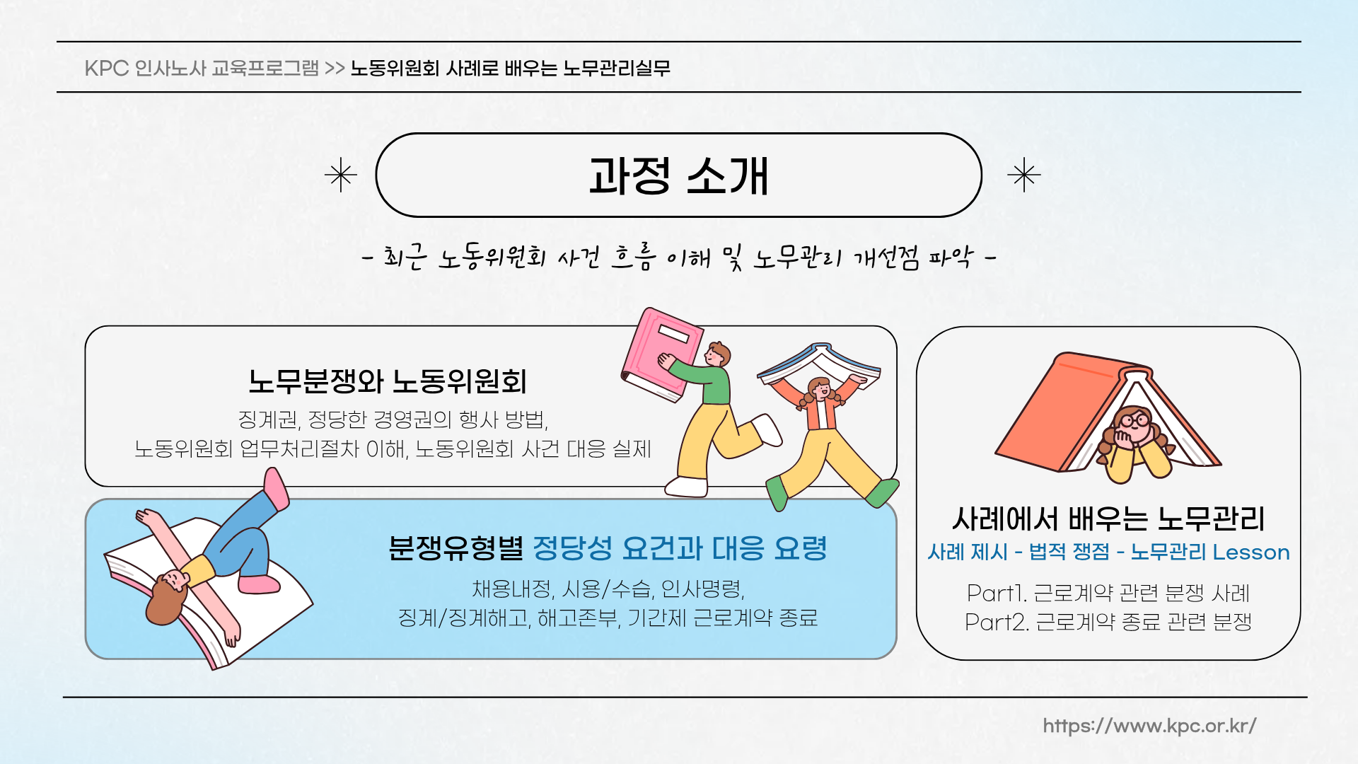 1 | 노무분쟁과 노동위원회(4H) | - 경영권과 인사권 - 징계권 - 정당한 경영권의 행사 방법 - 노무분쟁과 해결방법 - 노동위원회 업무처리절차 이해 - 노동위원회 사건 대응 실제 |