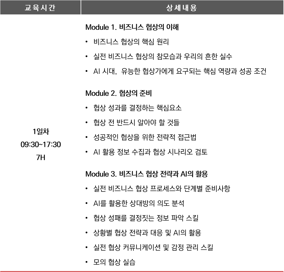l 성공적인 협상을 위한 핵심 원리와 프로세스를 이해하고, AI 활용·정보 분석·시나리오 도출 등 실무에 적용 가능한 방법을 익힐 수 있습니다.