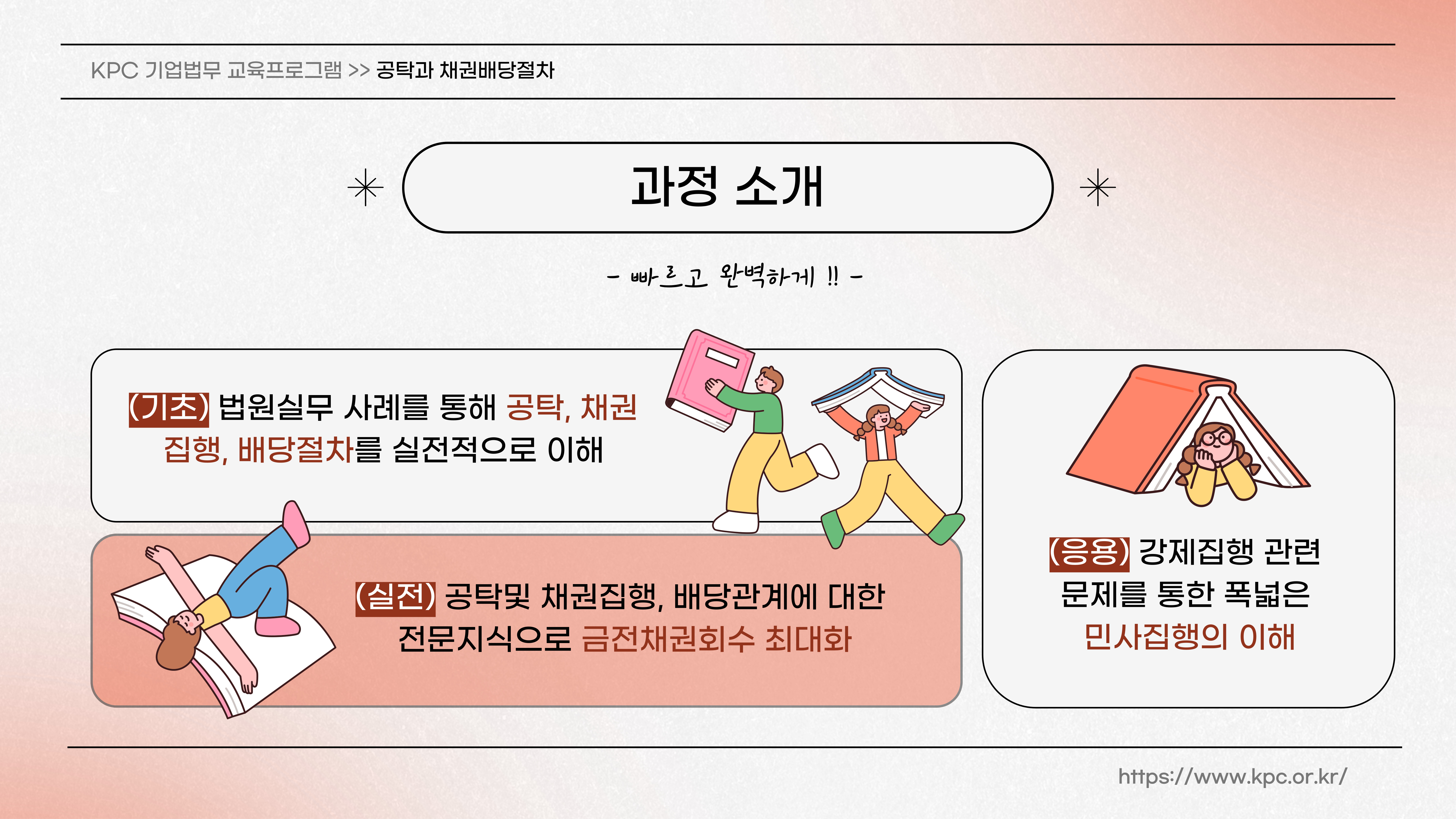 2 | 채권집행 필수개념 | 채권집행 일반 개념(집행의 대상, 압류절차, 압류의 경합, 저당권부 채권압류, 지시채권압류, 제3채무자 진술의무 등) 추심명령, 전부명령, 특별현금화명령 유체동산의 인도 또는 권리이전청구권에 대한 집행 부동산 등의 인도 또는 권리이전청구권에 대한 집행 물상대위에 의한 압류 및 추심(전부)명령 강제집행 정지 · 제한 · 취소 |
