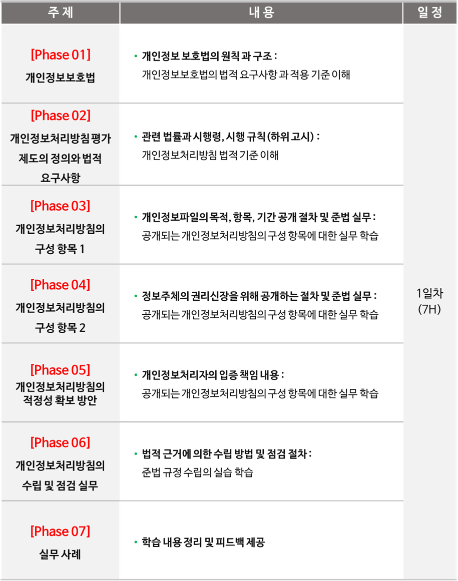 ■ 개인정보 보호 업무 신규 담당자, 관리자가 알아야 할 개인정보처리방침 평가 제도 대비 개인정보보호법의 법적 요구사항을 이해하고 학습한다.
