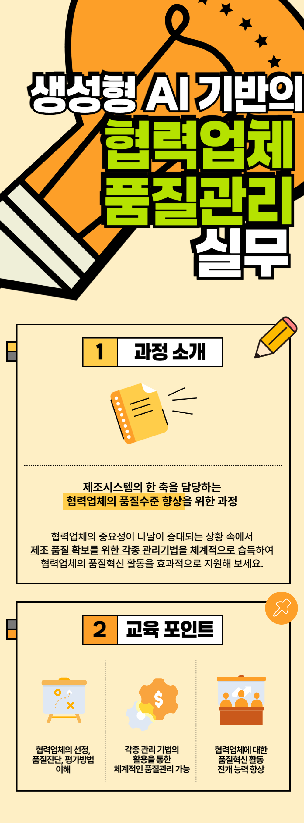 1일차 | o 품질경영과 파트너십 품질전략 - 품질경영과 품질보증시스템 - 품질보증시스템에서 외주품질의 중요성 - 외주품질방침의 수립과 관리지표 - 외주품질관리를 위한 조직과 관리 o 협력업체의 선정, 평가 기준 - 파트너십 협력업체의 선정 기준 - 파트너십 협력업체의 평정과 등급 관리 - 협력업체 감사의 목적과 활용 - 협력업체 감사절차와 유의점 - [실습] ChatGPT를 활용한 협력업체의 성장성, 수익성, 안정성, 활동성, 건전성 분석 |