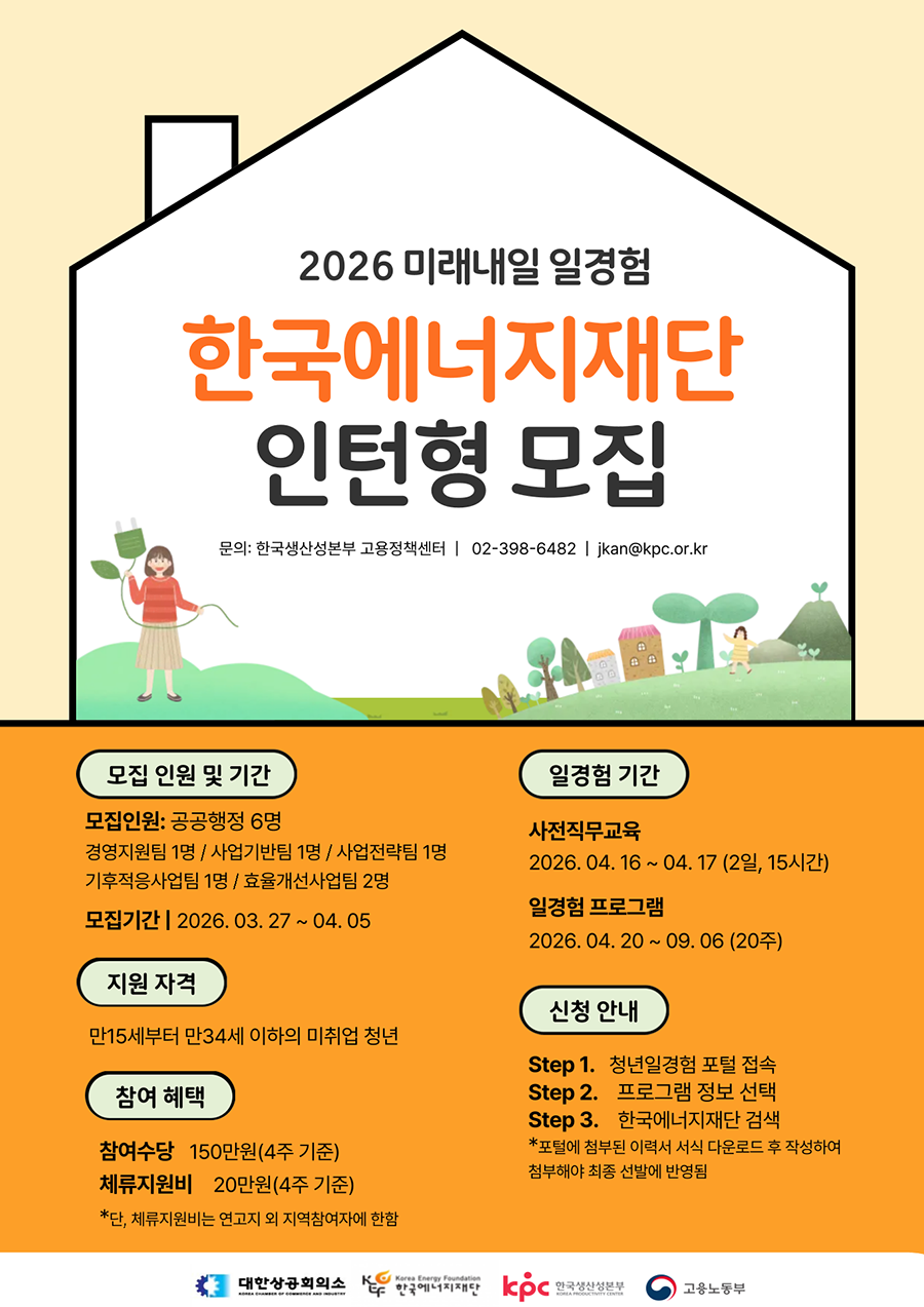 [한국생산성본부] 2026 미래내일 일경험(인턴형) 한국에너지재단 참여자 모집 (~4.5.(일) 23:59)