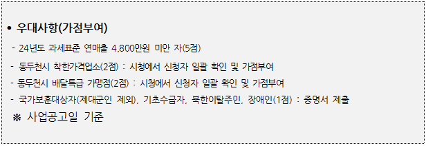 | • 신청대상 | 동두천시 관내 창업 6개월 이상 소상공인 중 2024년 매출액 10억원 이하 소상공인 사업자 *사업자등록증 상 개업연월일 2024.12.31.까지 신청가능 |