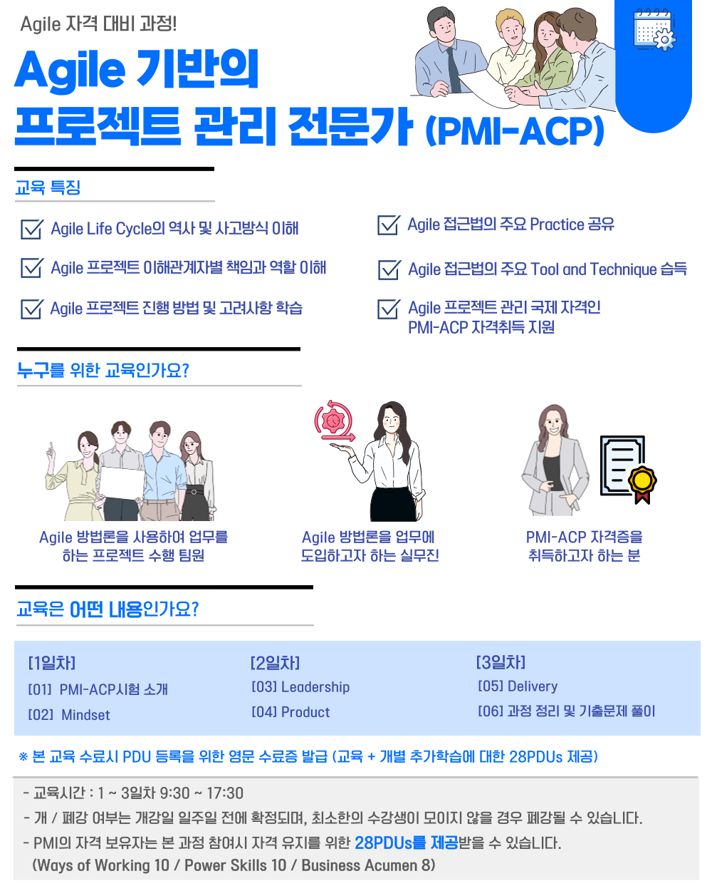 ■ PDU 등록을 위한 영문수료증 발행 : 교육 + 개별 추가 학습에 대한 28PDUs (Ways of Working 10 / Power Skills 10 / Business Acumen 8)