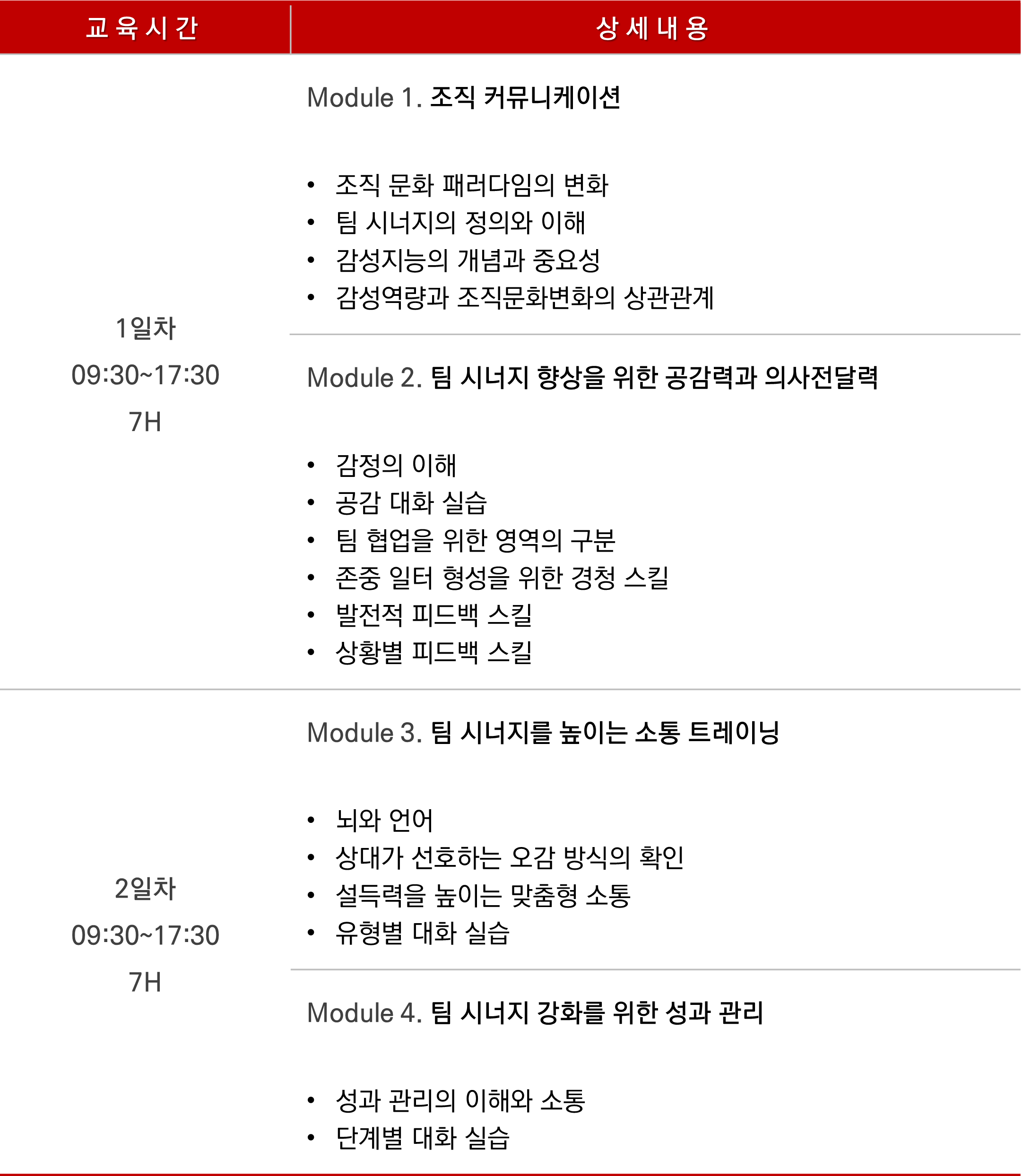 감성 역량은 어떻게 개발할 수 있는지, 감성을 바탕으로 어떻게 소통해야 업무 성과를 올리는 시너지를 창출 할 수 있는지, 본 과정을 통해 조직 감성 역량을 강화시키고, 신뢰와 상호 존중을 통한 성과 창출을 경험해보시기 바랍니다.