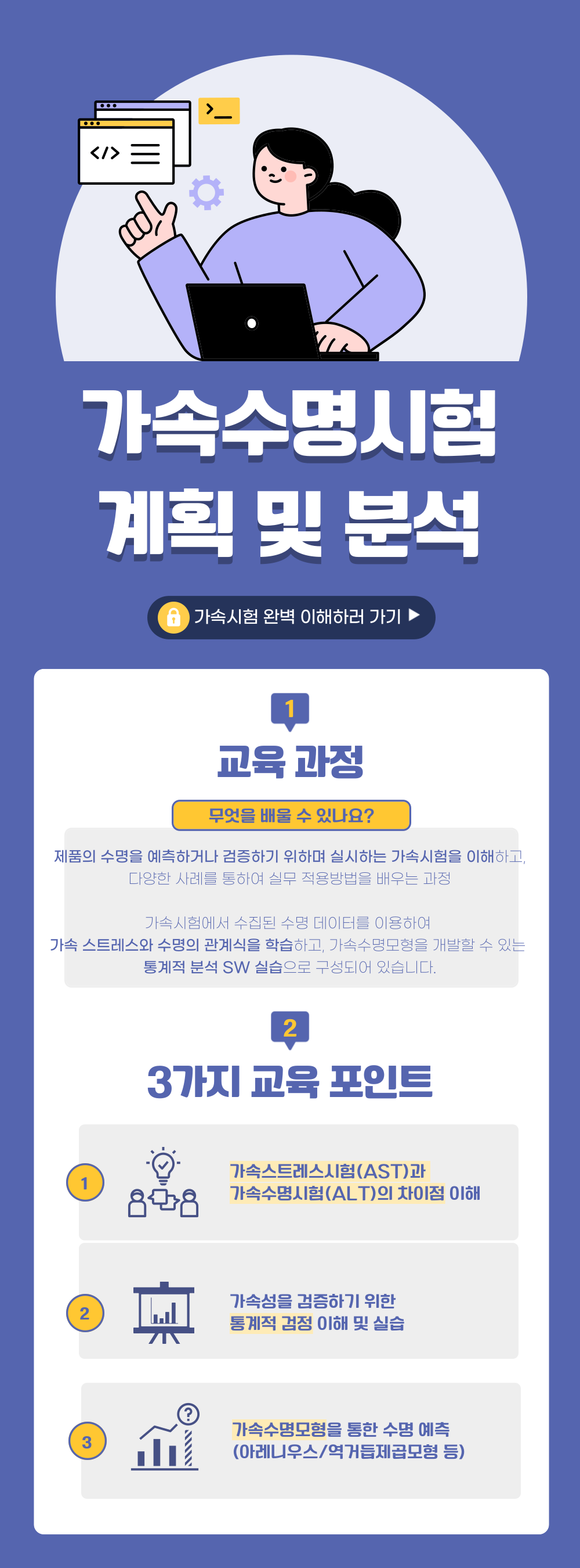 1일차 | o 가속시험 개요 - 가속시험(AT)이란? - 환경시험과 가속스트레스시험(AST) - 수명시험과 가속수명시험(ALT) o 가속성과 가속계수 - 가속성 검증을 위한 통계적 분석