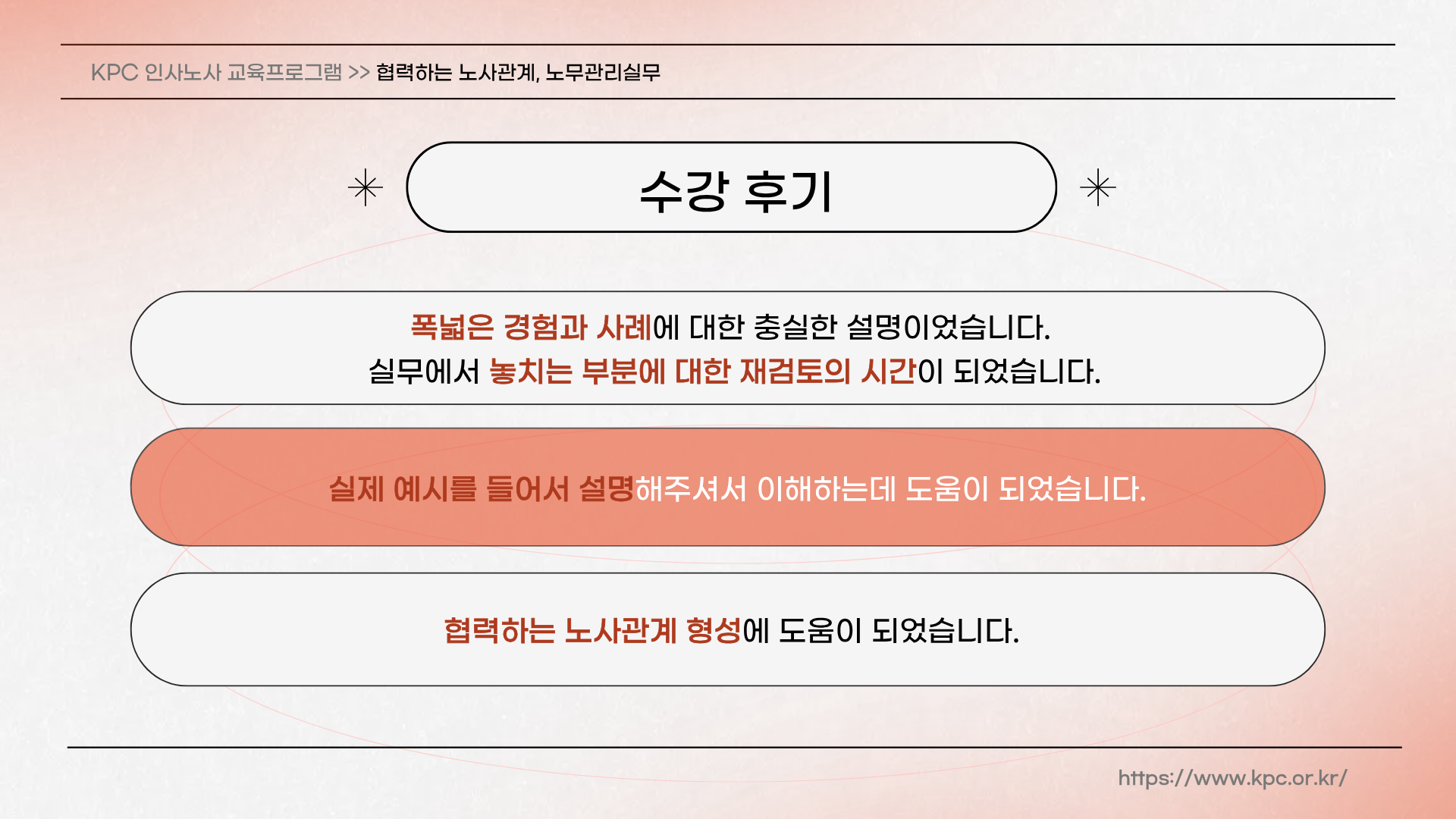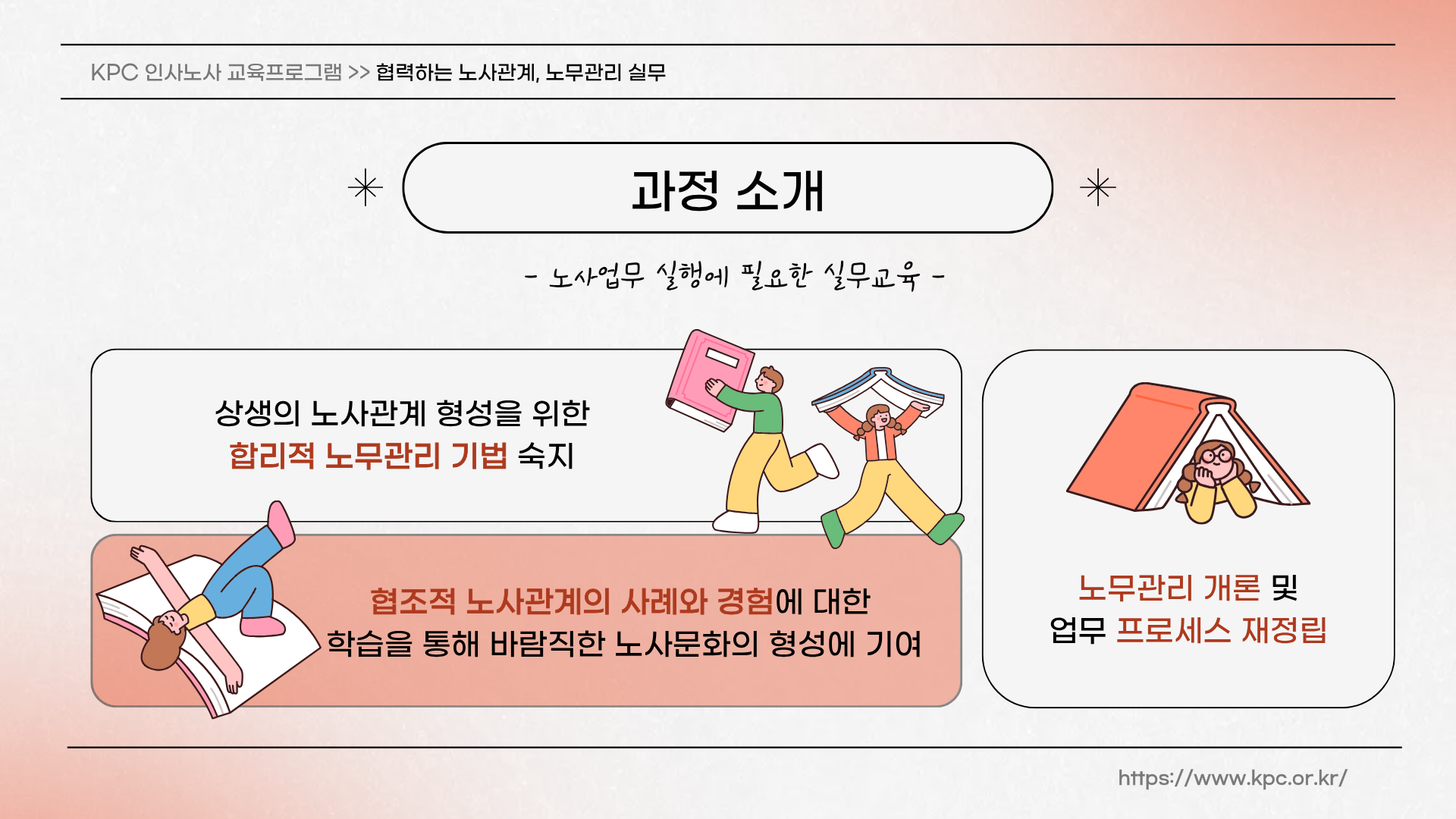 - 상생의 노사관계 형성을 위한 합리적 노무관리 기법을 숙지하고 협조적 노사관계의 사례와 경험에 대한 학습을 통해 바람직한 노사문화의 형성에 기여