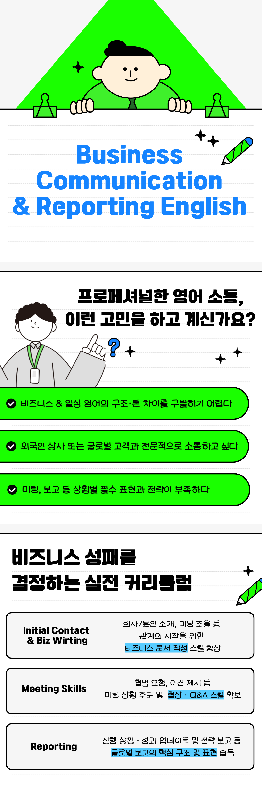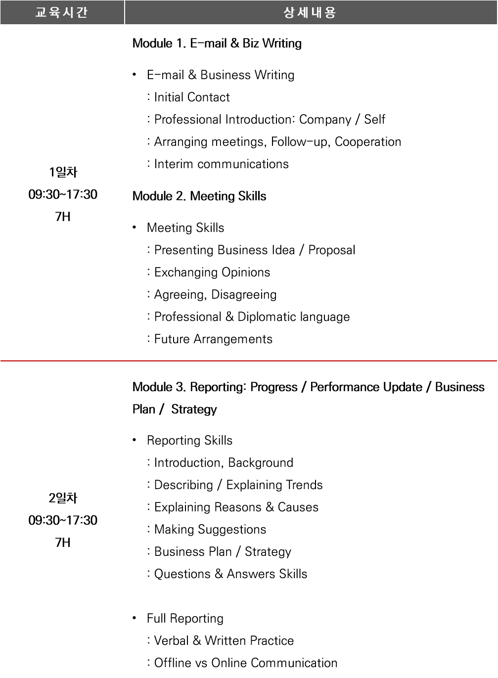 본 과정은 글로벌 고객뿐 아니라 국내 조직 내 외국인 상사·동료와 협업하는 업무 환경까지 고려해, Initial Contact?Meeting?Reporting으로 이어지는 핵심 커뮤니케이션 스킬을 단계적으로 학습하는 과정입니다.