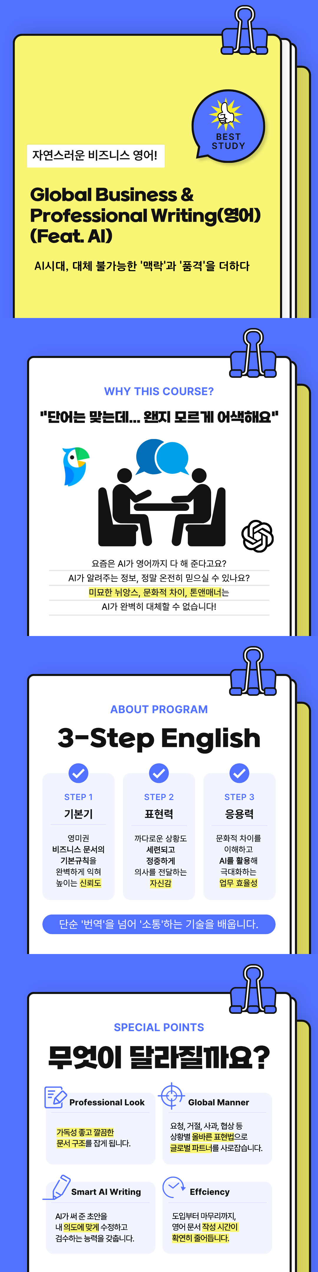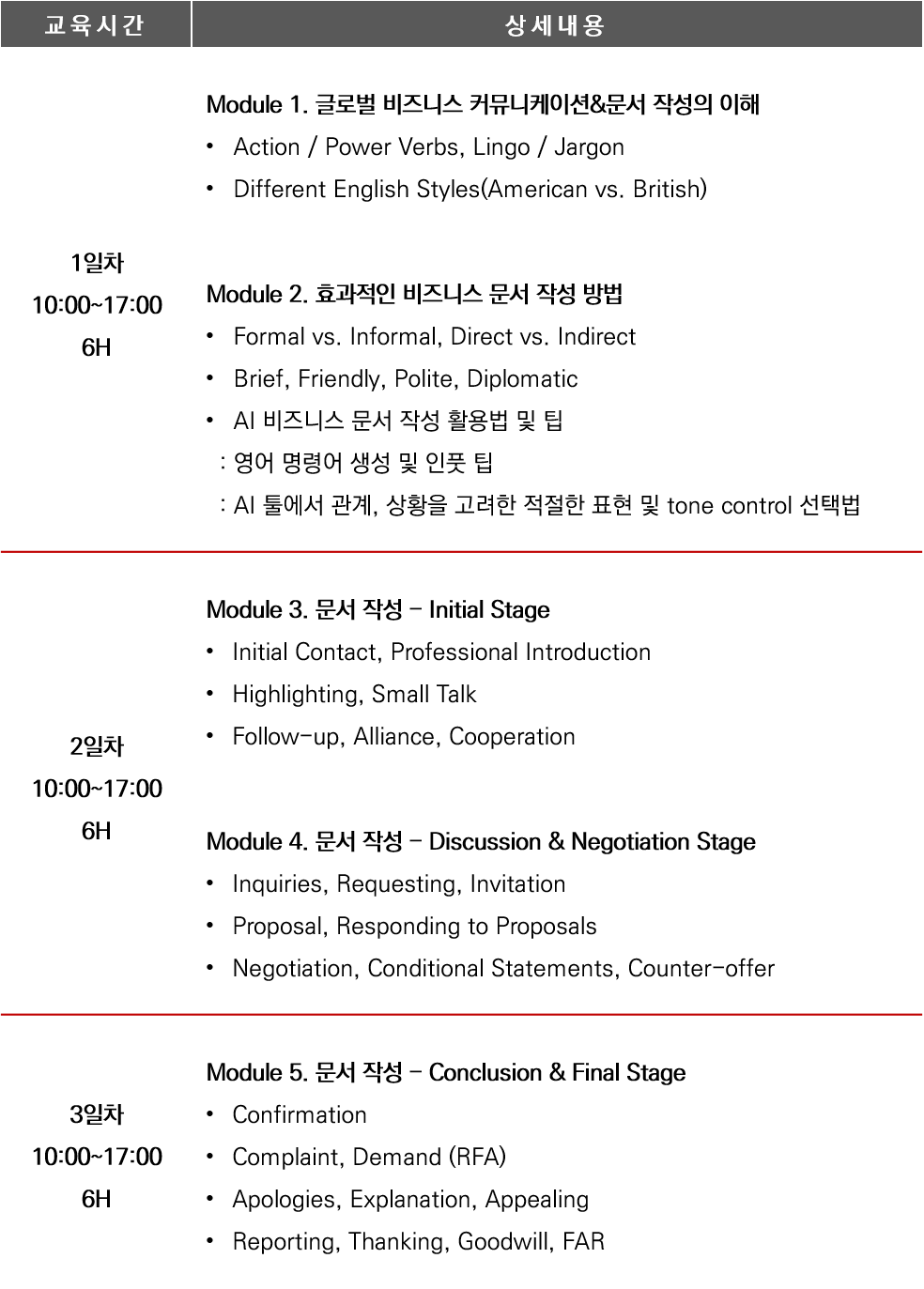 l 다양한 비즈니스 커뮤니케이션 스타일과, 비즈니스 단계에 적절한 문서 작성법을 익힐 수 있습니다.