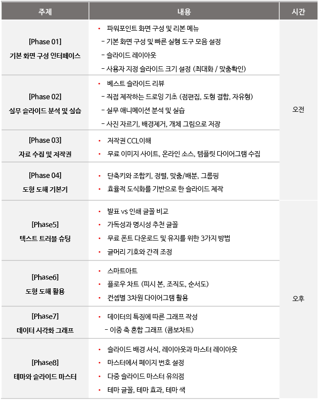 ■ 항상 사용하며 많은 문서를 만들지만, 단순 반복적인 사용 습관을 넘어가기 위해서는 특화된 교육이 필요합니다.■ 본 과정은 업무 용도에 맞는 디자인을 구성하는 다양한 기법과 예제를 학습합니다.