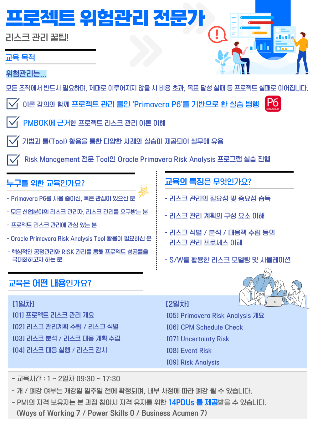 PMI 자격(PMP, PMI-RMP ) 유지 및 신규 응시를 위한 14PDUs를 취득할 수 있습니다.