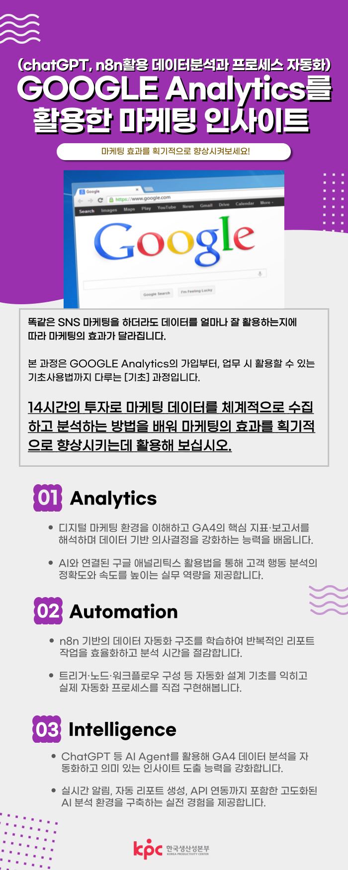 14시간의 투자로 마케팅 데이터를 체계적으로 수집하고 분석하는 방법을 배워 마케팅의 효과를 획기적으로 향상시키는데 활용해 보십시오.