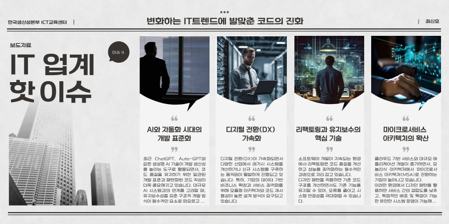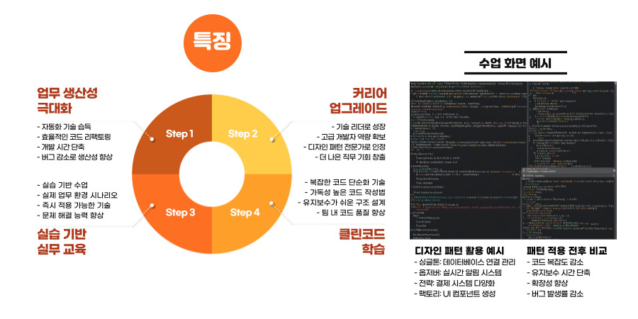 ■ 클린 코드 작성 역량 향상: 클린 코드 원칙을 적용해 가독성과 효율성을 높인 유지보수 가능한 코드를 작성할 수 있는 역량을 배양합니다.