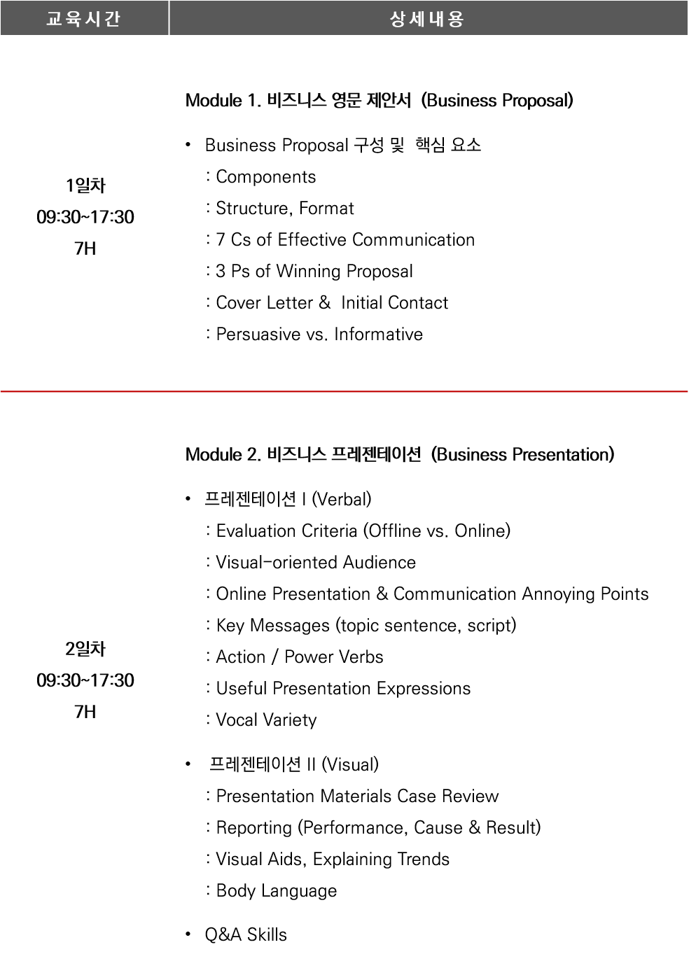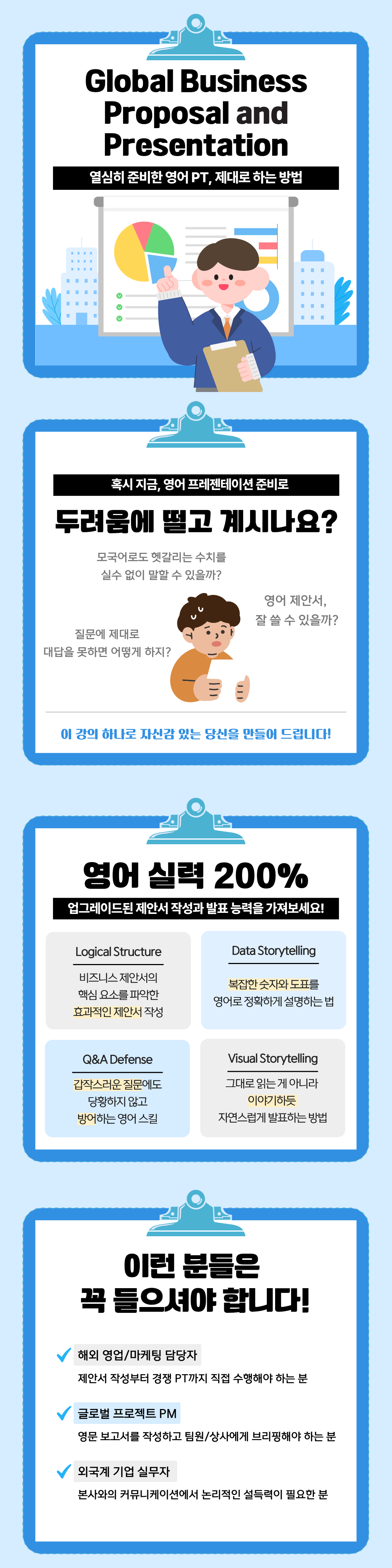 본 과정은 영문 비즈니스 제안서와 프레젠테이션을 효과적으로 작성하고 전달하기 위한 핵심 구성 원칙, 스토리라인 전략, 글로벌 커뮤니케이션 스킬을 체계적으로 학습하는 프로그램입니다.